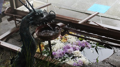 <<岩本寺:手水屋>> 手水鉢に生花が浮かんでいた。雨の中、一瞬の清涼が感じられらた。 青龍寺から岩本寺まで58km、岩本寺から金剛福寺まで87km、金剛福寺から延光寺まで59kmと、 この前後は、札所間の距離が最も長い区間になっている。 | ||