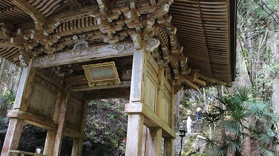 <<岩屋寺:仁王門>> 本堂の奥にひっそりと建っている。言われなければ、仁王門とはわからない。 歩き遍路は、44番札所大寶寺から尾根伝いに山道を抜けて、こちらから参拝するので、境内の入り口になる。 車で来る遍路は、いわば裏口から参拝しているようなものらしい。 仁王門は、寛政2年(1790年)の建立。 | ||